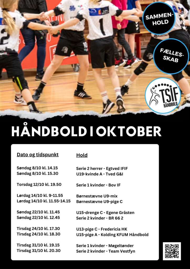 Vi starter oktober ud med flere seniorkampe. Lige før efterårsferien indtager vores U9-mix hallen, og efter efterårsferien kan du se vores U15-drenge C og serie 2 kvinder boltre sig.